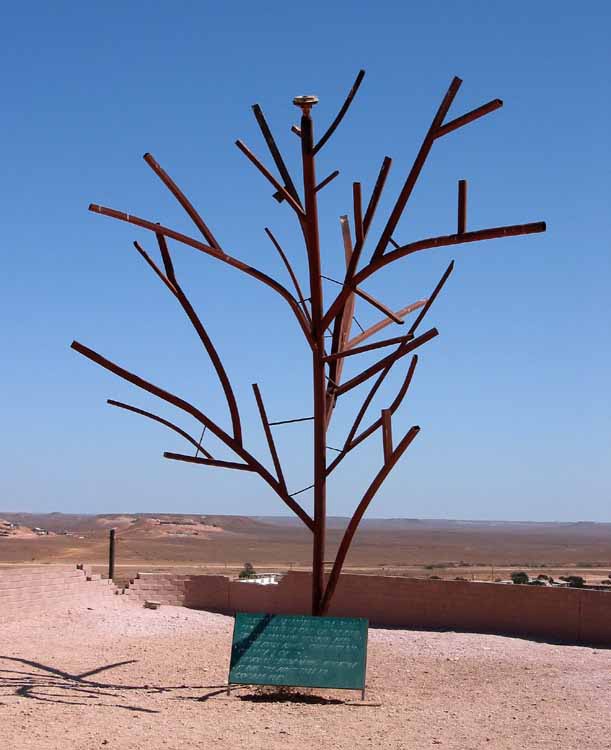 Bob had Joe Diosisio, a boilermaker working for him at the time, cut and weld the bits together to his design. The tree originally stood in the Amorosi yard (Coober Pedy Trading Company), on Seventeen Mile Rd. It had roots to hold it firm and a wheel hub welded on top.